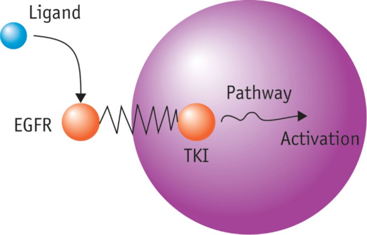– Các phân tử nhỏ EGFR TKIs gắn vào vị trí đặc hiệu tại vùng nội bào (hoạt tính tyrosine kinase) của EGFR, cạnh tranh với ATP nhờ có ái lực mạnh hơn. Không có ATP, tyrosine kinase không thể thực hiện phản ứng phosphoryl hoá để khởi phát các dòng tín hiệu nội bào.