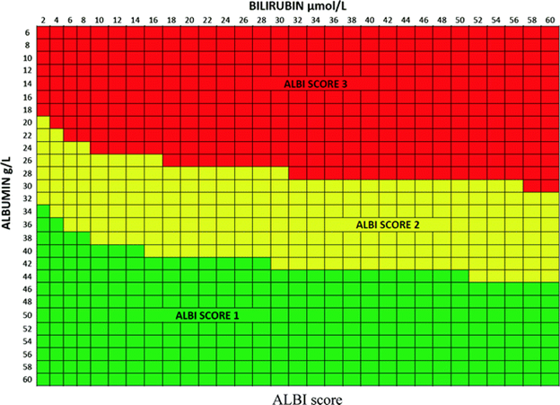 ALBI score = (log10 bilirubin [µmol/L] × 0.66) + (albumin [g/L] × −0.0852)