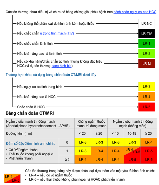 Một số phác đồ khác của châu Âu, Mĩ (3, 4) lại đề cao vai trò của chẩn đoán hình ảnh, đặc biệt chụp CT- Scanner ổ bụng đa dãy có tiêm thuốc cản quang hoặc MRI có tiêm chất cản từ, với tổn thương mang tính chất wash out điển hình là có thể kết luận HCC dựa trên bảng LIRADS (5)