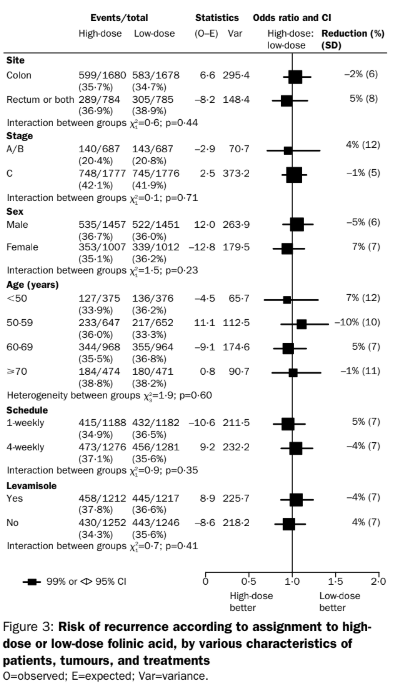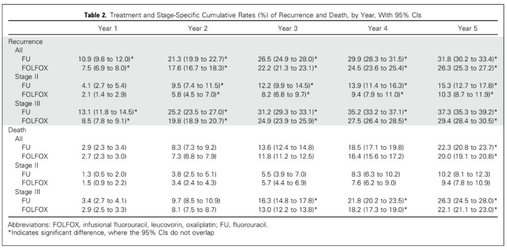 Các phân tích tổng hợp khác đã cho thấy những cải thiện nhỏ về DFS (5% – 10%) nhưng không cải thiện về OS đối với việc sử dụng 5-FU so với quan sát trong ung thư đại tràng giai đoạn II [13-16]. Phân tích dưới nhóm ở bệnh nhân giai đoạn II từ các thử nghiệm MOSAIC và NSABP C-07 cho thấy không có lợi ích có ý nghĩa thống kê về cả OS hoặc DFS khi bổ sung oxaliplatin vào 5-FU [5]. Những phát hiện này cũng được ủng hộ bởi một phân tích tổng hợp của cơ sở dữ liệu ACCENT (Adjuvant Colon Cancer End Points) [17-19].