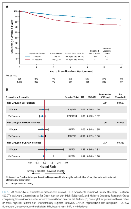 Sau một thời gian theo dõi dài hơn, kết quả cập nhật cho thấy DFS- 5 năm là 69,1% so với 70,8% (HR = 1,08; 95% CI = 1,01 – 1,15; tỷ lệ phát hiện sai được điều chỉnh P = 0,22); tỉ lệ OS-5 năm là 82,4% so với 82,8% (HR = 1,02; 95% CI = 0,95 – 1,11) và chênh lệch tuyệt đối về tỉ lệ OS-5 năm là -0,4% (95% CI = -2,1% đến 1,3%) [11]. Cùng với nhau, những dữ liệu này gợi ý nêu bật ý nghĩa của việc phân tầng nguy cơ dựa trên giải phẫu bệnh và khả năng rút ngắn thời gian điều trị bằng CAPOX, đặc biệt ở những bệnh nhân có nguy cơ thấp.