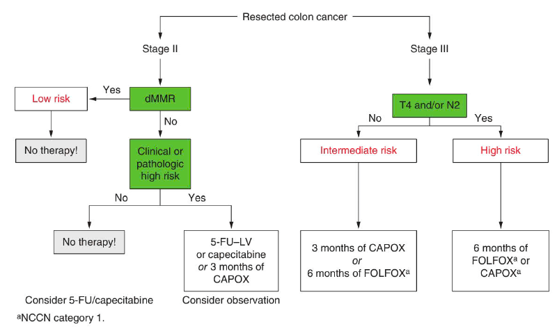 Bệnh nhân ung thư đại tràng giai đoạn III thường được hóa trị hỗ trợ từ 3 đến 6 tháng với fluoropyrimidine kết hợp oxaliplatin. Sự cải thiện DFS khi bổ sung oxaliplatin vào fluoropyrimidine đã được chứng minh bằng hai thử nghiệm lớn pha III.