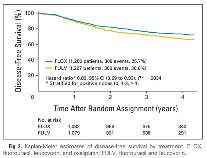 Thử nghiệm MOSAIC ở Châu Âu (Multicenter International Study of Oxaliplatin/5-Fluorouracil/Leucovorin in the Adjuvant Treatment of Colon Cancer) đã chọn ngẫu nhiên 2246 bệnh nhân (60% ở giai đoạn III) dùng FOLFOX (truyền 5-fluorouracil [5-FU] , leucovorin calcium và oxaliplatin) so với 5-FU và leucovorin. Thử nghiệm này đã chứng minh sự cải thiện về tiêu chí chính DFS-5 năm từ 67% đến 73% ở những bệnh nhân được bổ sung oxaliplatin vào 5-FU [5]. Lợi ích về OS đã được ghi nhận ở phân nhóm giai đoạn III (OS-10 năm, 67% so với 59%; HR = 0,80; P = 0,016) [5].