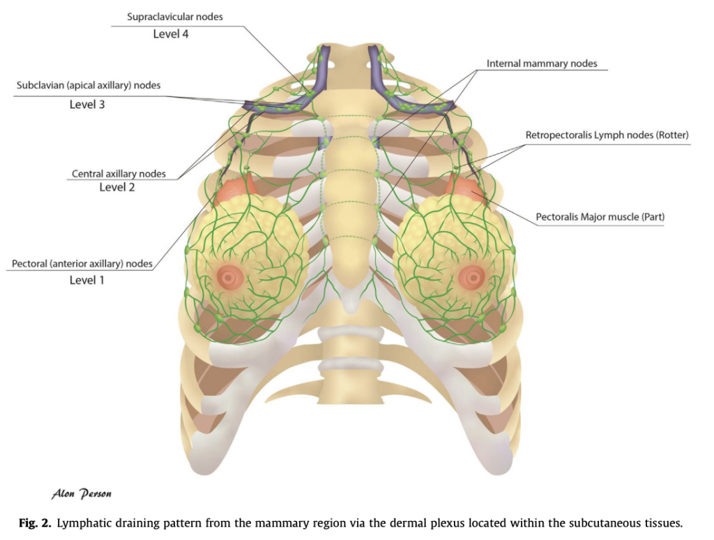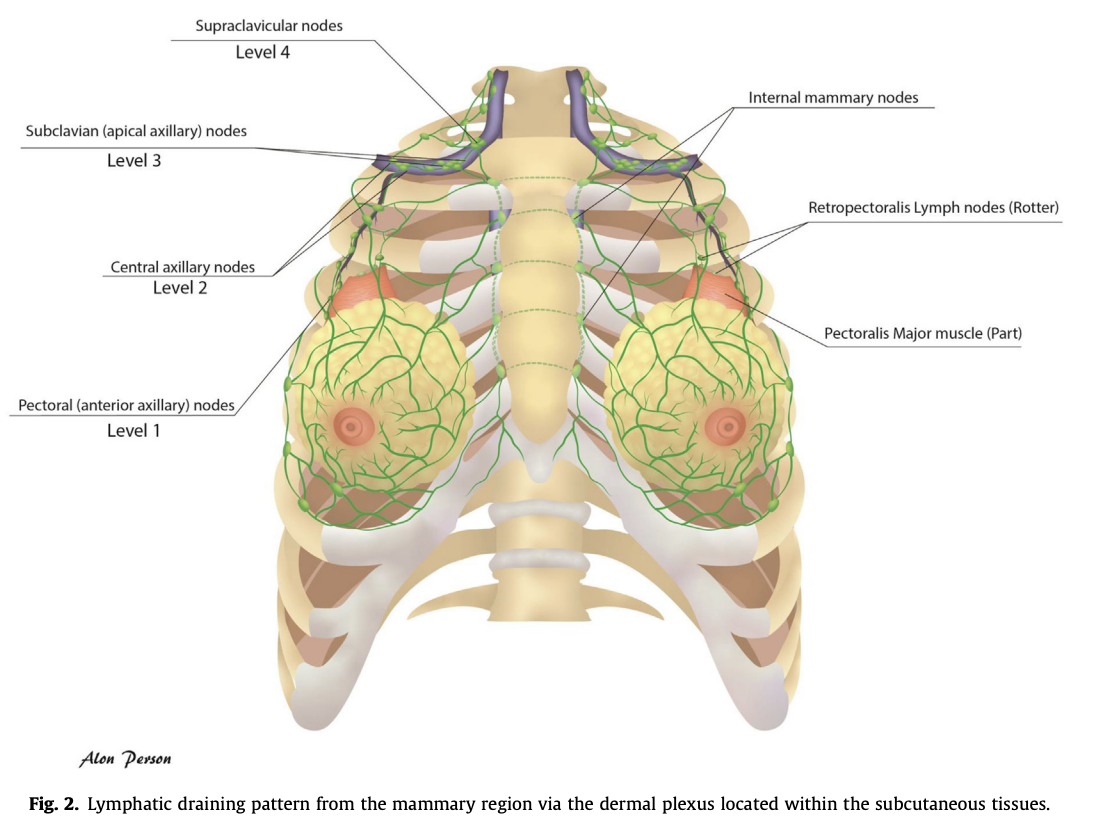 Bạch huyết từ vùng tuyến vú được dẫn lưu qua mạng lưới của da nằm trong tổ chức mô dưới da (Ảnh 2). Mô tuyến nằm trên mạc sau tuyến vú không liên tục với cơ ngực lớn, vì vậy, nếu không có xâm lấn cơ, cơ ngực lớn sẽ không thuộc về CTVp_chestwall. Khoảng 3/4 bạch huyết sẽ đổ về các hạch nách. Bạch huyết cũng có thể dẫn lưu qua kết nối dọc theo các bờ của mô tuyến, sau đó vòng theo bờ của cơ ngực lớn để đến hạch gian cơ ngực (Hạch Rotter) hoặc xuyên qua hoặc giữa các cơ ngực đến trực tiếp các hạch đỉnh hố nách. Bạch huyết còn có thể được dẫn lưu dọc theo các mạch máu đâm xuyên, tại bờ trong của cơ ngực lớn, đến các hạch vú trong. Như vậy, một mạng lưới bạch huyết sâu (Chặng 2-4) là một phần của thể tích bia với các bệnh nhân có giai đoạn bệnh tiến triển hơn, ở một số trường hợp, xạ trị hạch vú trong có thể được cân nhắc. Các thể tích bia dự phòng hạch nên được xây dựng theo các hướng dẫn đã xuất bản của ESTRO.