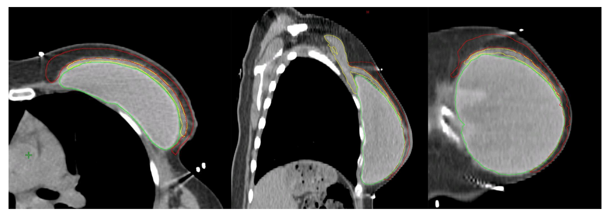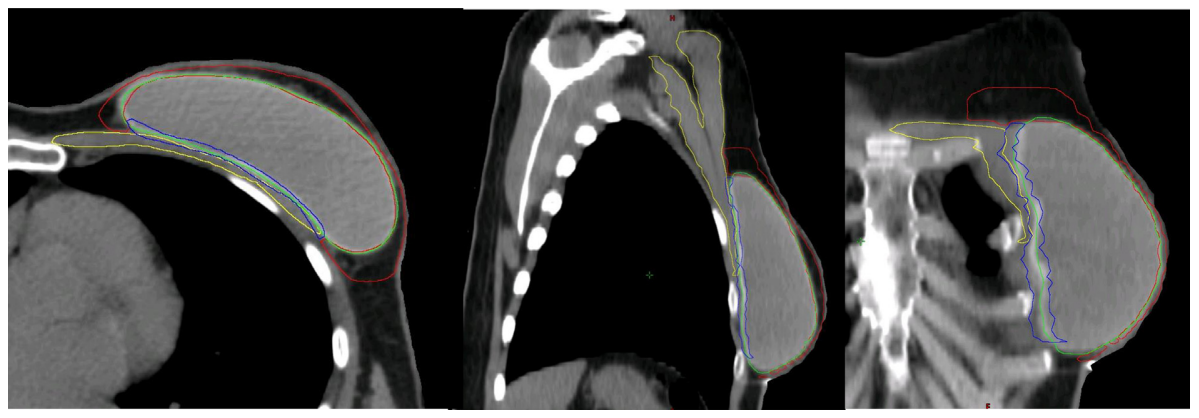 Hình 4b. CTVp_chestwall với phần trước (Đỏ) và sau (Xanh biển) trong trường hợp tổ chức bạch huyết dưới da cần được chiếu xạ cũng như phần thành ngực ban đầu không được bao phủ bởi cơ ngực lớn (Vàng). Túi độn sau cơ ngực (Xanh lá cây).