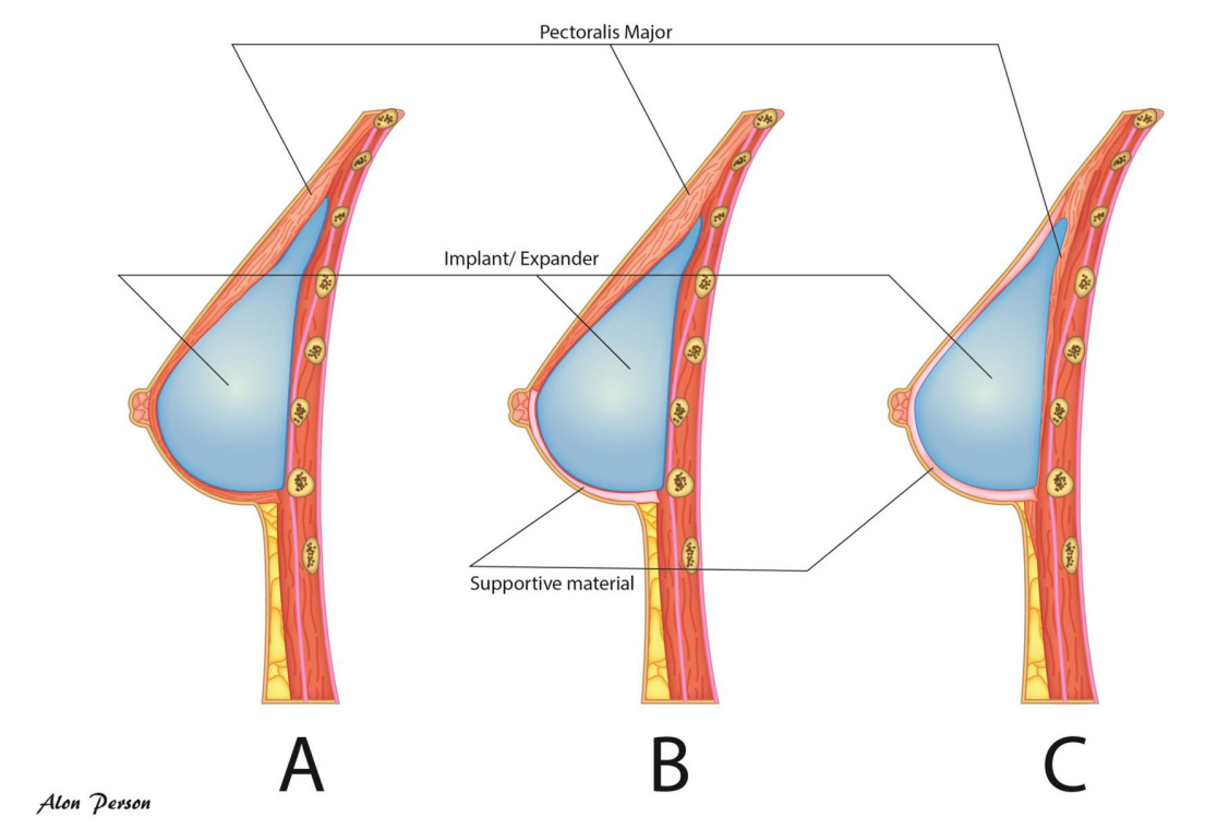 Hình 3. Các vị trí đặt túi độn. (A) Sau cơ ngực lớn, bao phủ toàn bộ bởi cơ ngực lớn; (B) Sau cơ ngực lớn với bao phủ một phần bởi cơ ngực và vật liệu hỗ trợ ở phần thấp; (C) Trước cơ ngực với bao phủ toàn bộ bởi vật liệu hỗ trợ.