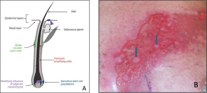 Cùng với thời gian và/hoặc liều xạ trị đến da tăng dần, mất hoàn toàn lớp sừng có thể xảy ra, kết quả là bong vảy ướt. Biểu bì được tái tạo thông qua sự tăng sinh của các tế bào từ nguồn tế bào gốc. Các tế bào gốc thực sự được tìm thấy tại đoạn phình của nang lông. Từ đây, các tế bào gốc di chuyển đến rễ của nang lông, hoặc đến biểu bì (Hình 1a). Khi tổn thương bong vảy ướt bắt đầu hồi phục, da tái tạo từ các nang lông với các “đảo” nhỏ da mới mở rộng và kết nối với nhau (Hình 1b). Trong điều kiện mất cân bằng của các cytokine “tiền viêm” và “tiền xơ hoá”, RID mạn tính có thể biểu hiện. Tình trạng không thể đảo nghịch này được đặc trưng với sự thay đổi cấu trúc mạch máu, sắc tố và mô xơ.