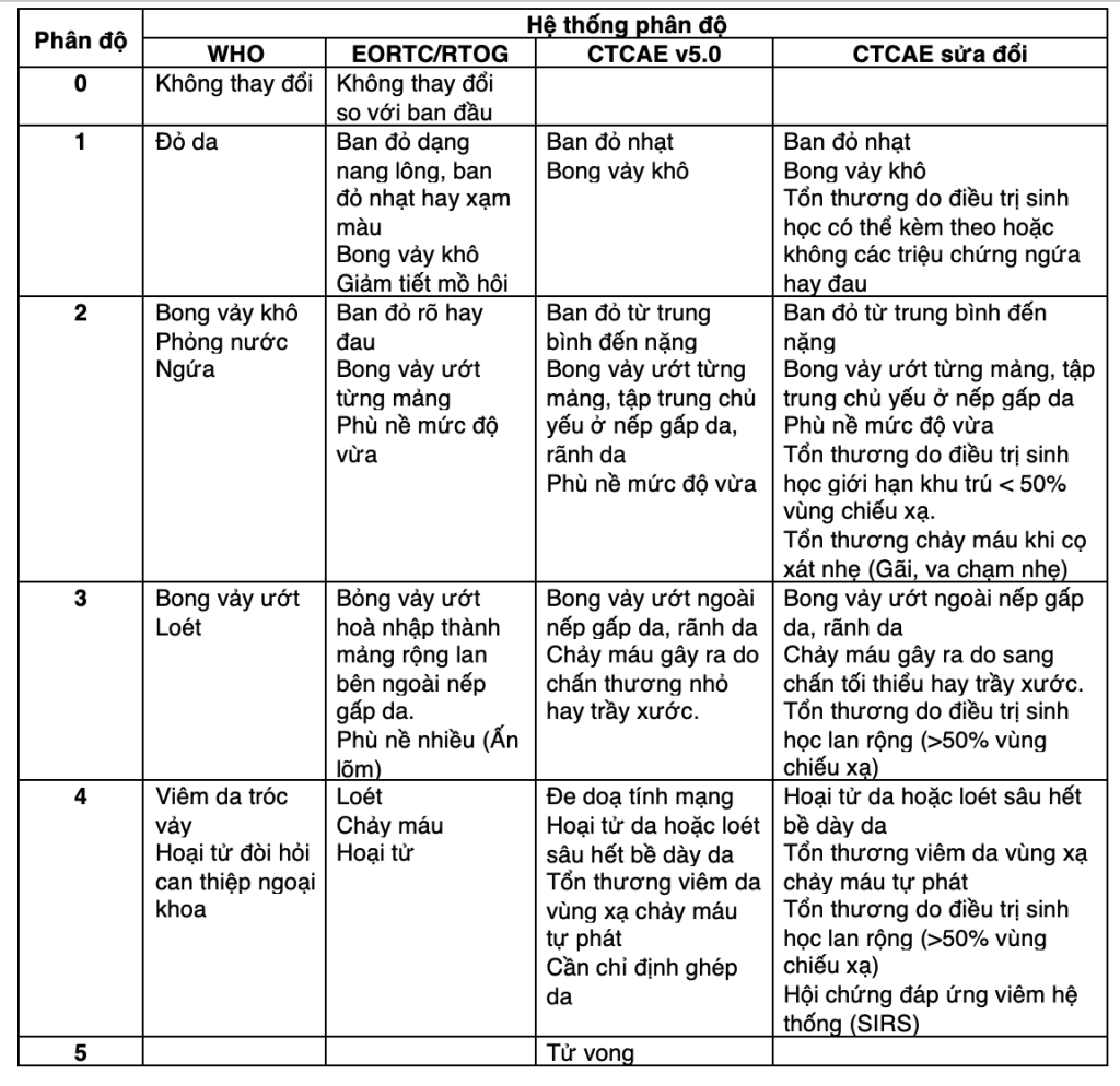 Một hệ thống thay thế khác của EORTC/RTOG, được sử dụng trong các hướng dẫn thực hành của Italia và Vương quốc Anh. Mặc dù chỉ khu trú vào các độc tính cấp, hệ thống này đã cho thấy có tỷ lệ cao sự khác biệt giữa các nhà lâm sàng khi so sánh với các hệ thống khác. Bảng dưới đây trình bày và so sánh các hệ thống phân độ phổ biến cho viêm da do xạ trị: